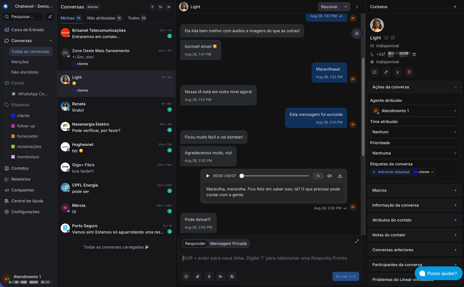 Conversa entendendo áudios, imagens e documentos. Pode transferir a conversa para um humano e fazer follow-up.